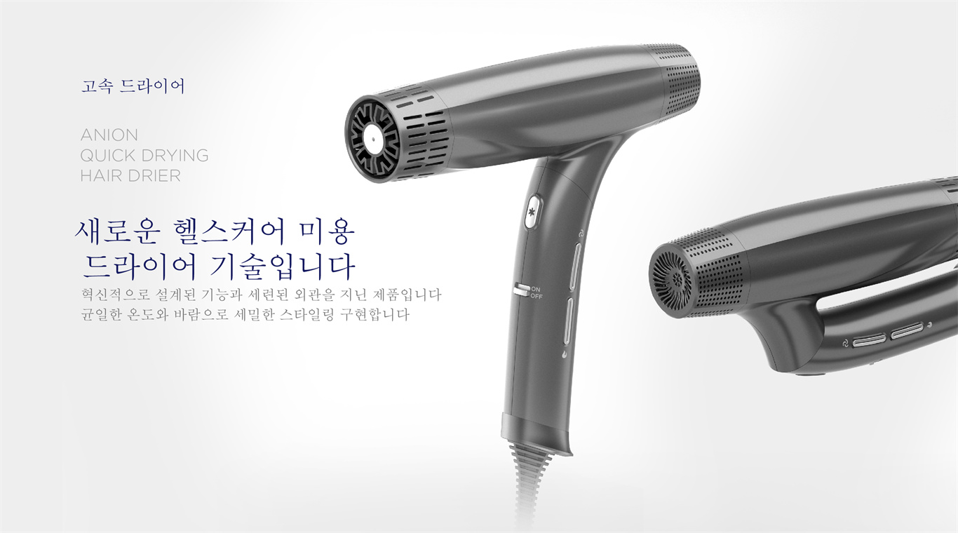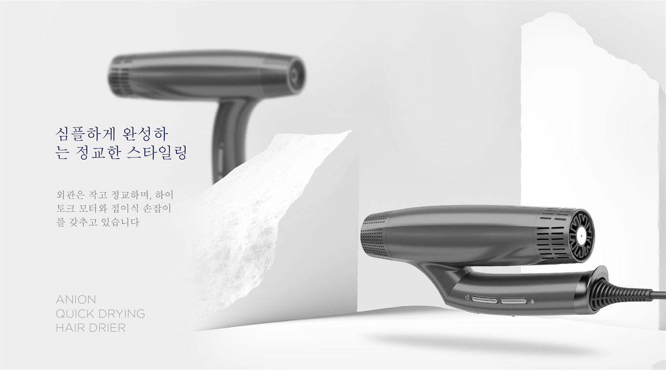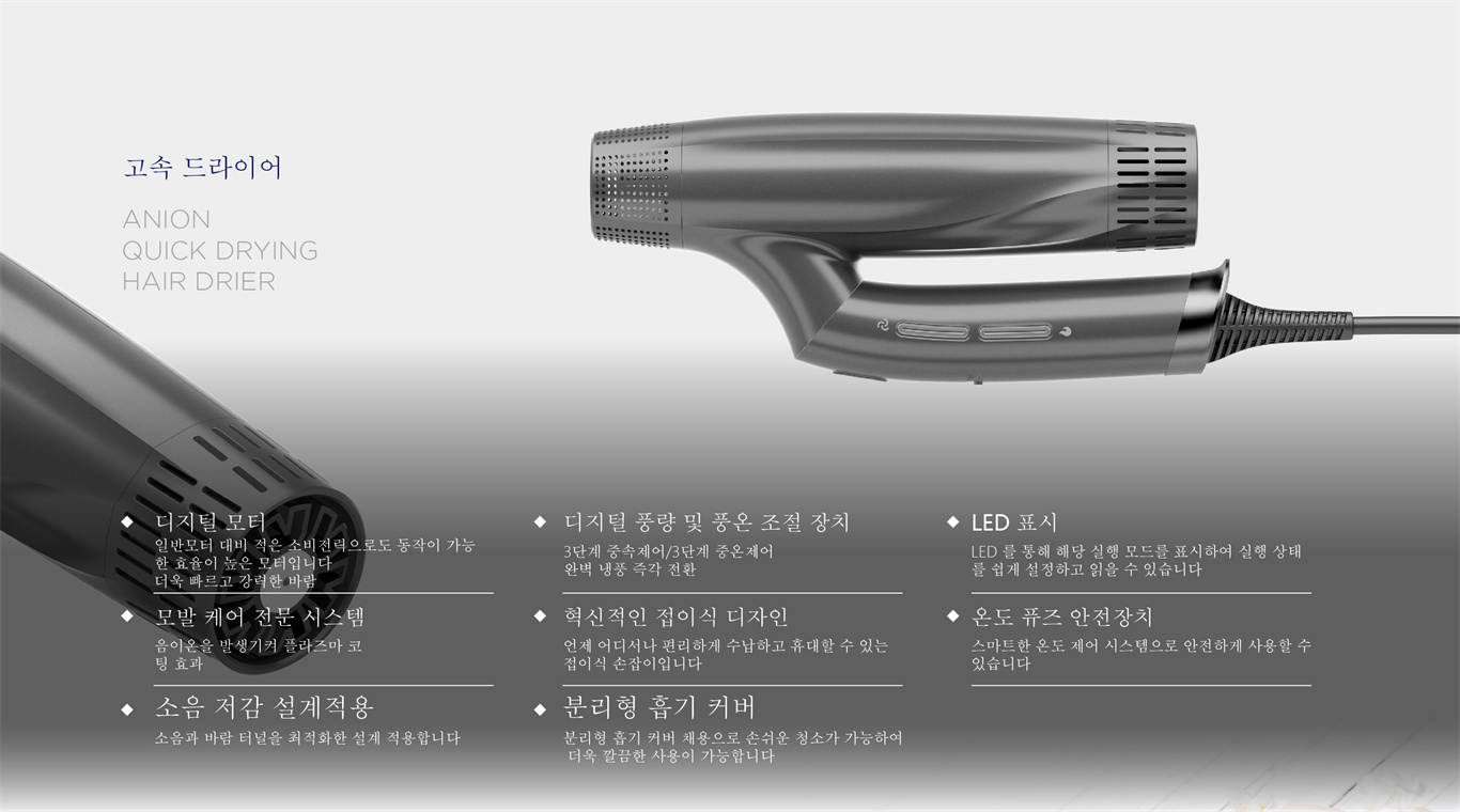 제품 기능能◆외관은 작고 정교하며, 하이토크 모터와 접이식 손잡이를 갖추고 있고 마른 머리카락 속도가 30% 빠릅니다. ◆디지털 모터 최대 110,000r/분 일반모터 대비 적은 소비전력으로도 동작이 가능한 효율이 높은 모터입니다. ◆3단계 중속제어/3단계 중온제어 완벽 냉풍 즉각 전환 ◆음이온을 발생기켜 플라즈마 코팅 효과 ◆스마트한 온도 제어 시스템으로 안전하게 사용할 수 있습니다. ◆소음과 바람 터널을 최적화한 설계 적용합니다. ◆이 기계는 역방향 드라이어 (냉풍만 해당) 자동 청소 기능을 제공합니다. ◆30분 사용하지 않을경우 전원 OFF