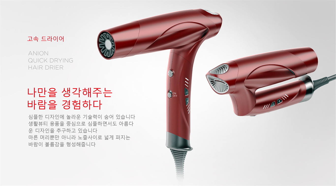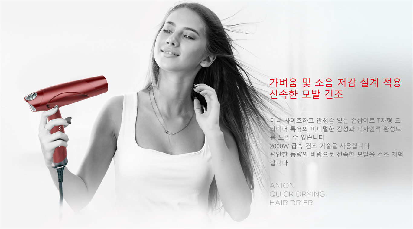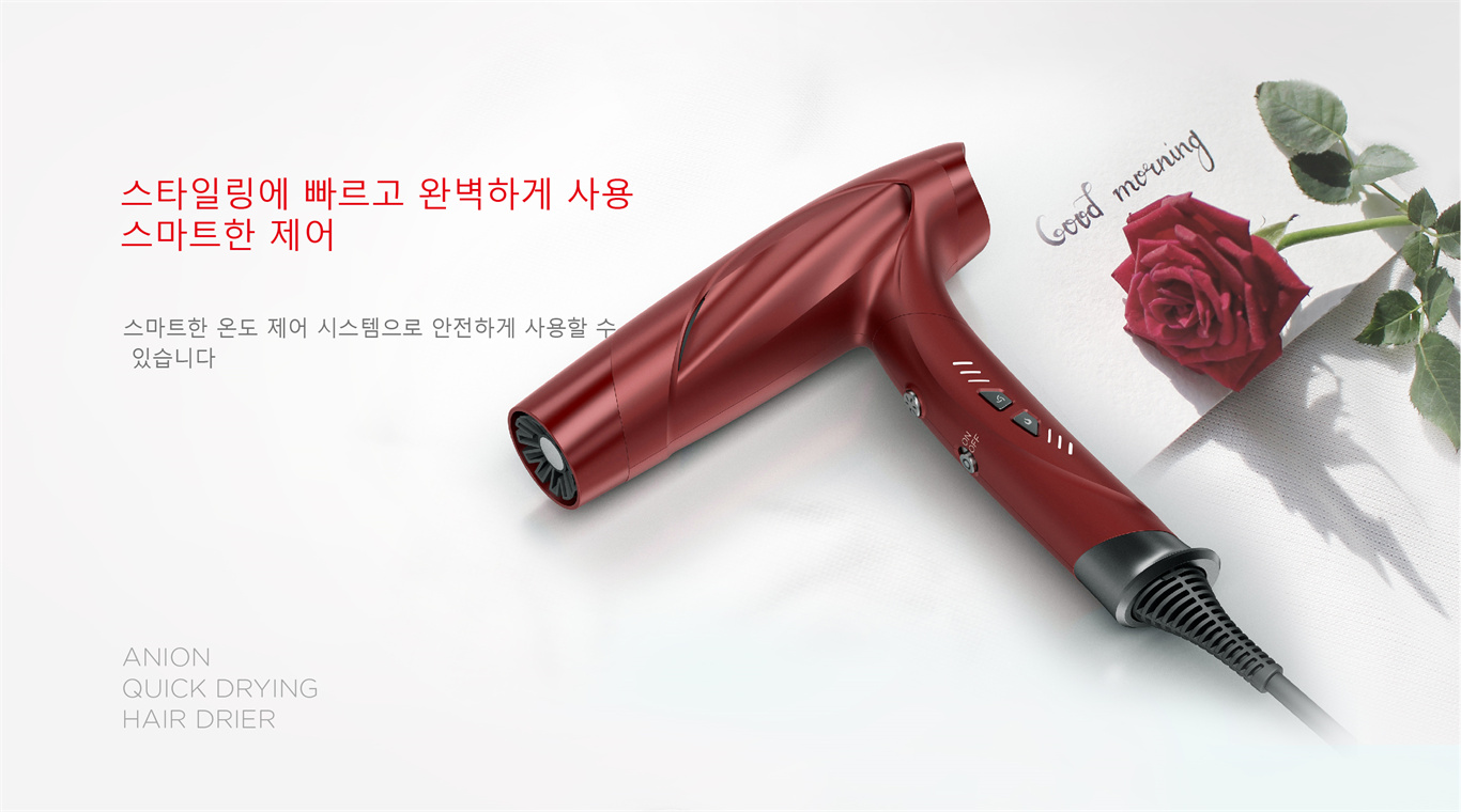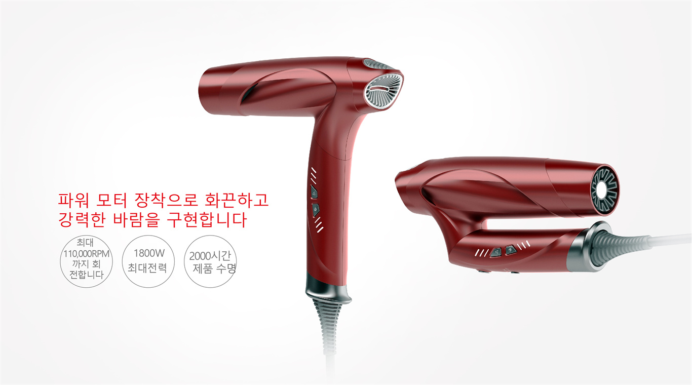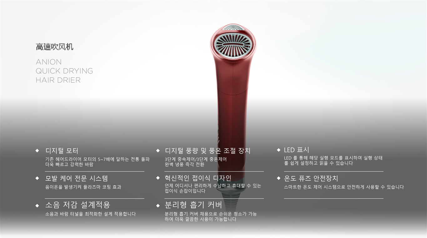 제품 기능能◆외관은 작고 정교하며, 하이토크 모터와 접이식 손잡이를 갖추고 있고 마른 머리카락 속도가 30% 빠릅니다. ◆디지털 모터 최대 110,000r/분 일반모터 대비 적은 소비전력으로도 동작이 가능한 효율이 높은 모터입니다. ◆3단계 중속제어/3단계 중온제어 완벽 냉풍 즉각 전환 ◆음이온을 발생기켜 플라즈마 코팅 효과 ◆스마트한 온도 제어 시스템으로 안전하게 사용할 수 있습니다. ◆소음과 바람 터널을 최적화한 설계 적용합니다. ◆이 기계는 역방향 드라이어 (냉풍만 해당) 자동 청소 기능을 제공합니다. ◆30분 사용하지 않을경우 전원 OFF