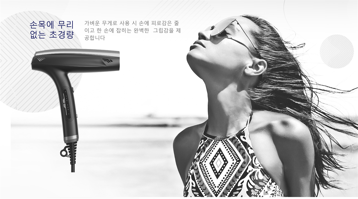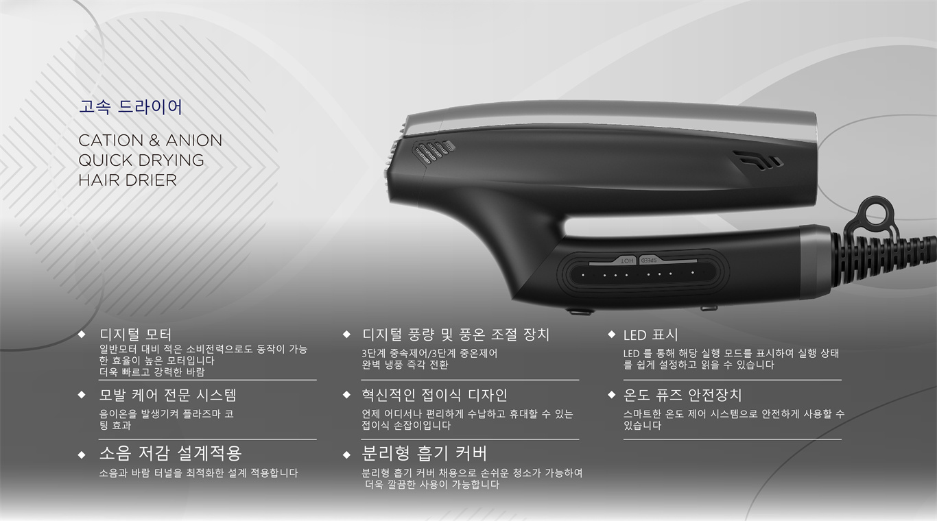 제품 기능能◆외관은 작고 정교하며, 하이토크 모터와 접이식 손잡이를 갖추고 있고 마른 머리카락 속도가 30% 빠릅니다. ◆디지털 모터 최대 110,000r/분 일반모터 대비 적은 소비전력으로도 동작이 가능한 효율이 높은 모터입니다. ◆3단계 중속제어/3단계 중온제어 완벽 냉풍 즉각 전환 ◆음이온을 발생기켜 플라즈마 코팅 효과 ◆스마트한 온도 제어 시스템으로 안전하게 사용할 수 있습니다. ◆소음과 바람 터널을 최적화한 설계 적용합니다. ◆이 기계는 역방향 드라이어 (냉풍만 해당) 자동 청소 기능을 제공합니다. ◆30분 사용하지 않을경우 전원 OFF